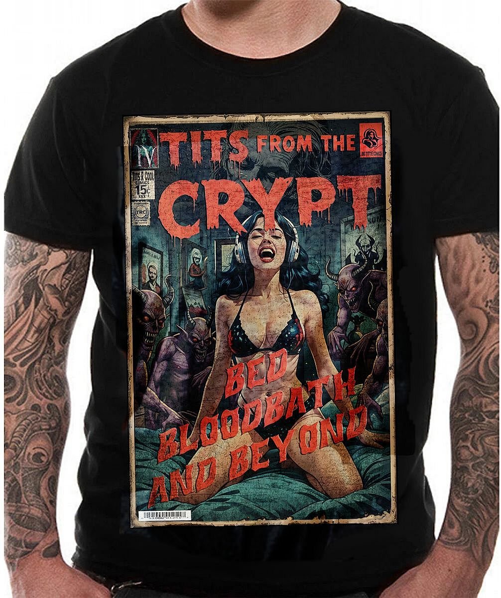 Our “Bed Bloodbath and Beyond” tee from our “Tits From the Crypt” series drips with campy, comic-book horror charm. Inspired by vintage monster shock creature feature style…this design blends spooky humor with retro fright-night flair. Think eerie panels, bold ink lines, and a splash of over-the-top mischief straight out of a midnight monster comic. Printed on soft, 100% or blended cotton, it’s built for comfort while serving major haunted-house attitude. Fun, freaky, and full of old-school personality. This shirt brings that perfect mix of spooky grin and throwback grin-and-gore energy. A must-have for anyone who loves their horror playful, their style bold, and their scares served with a wink.