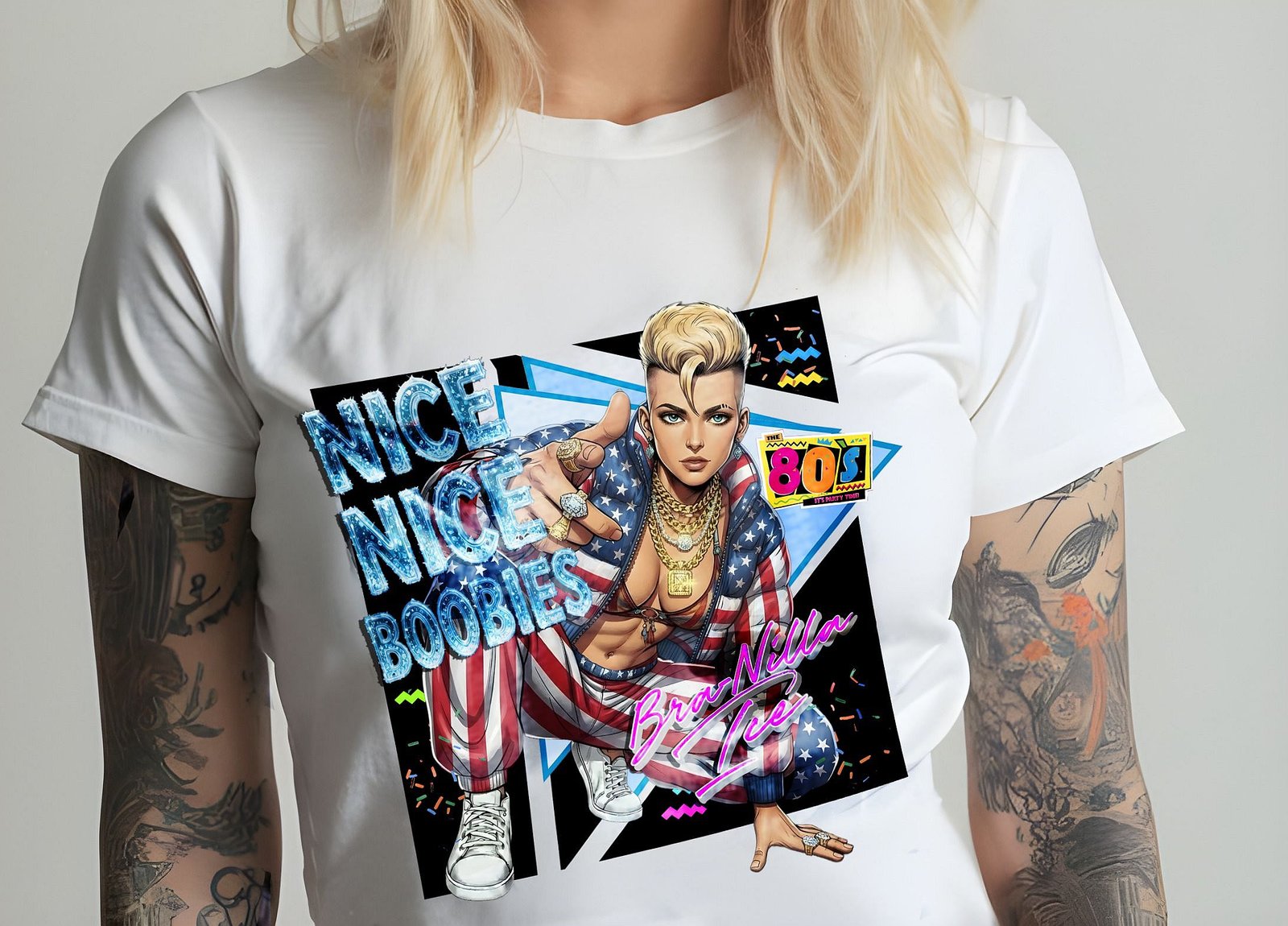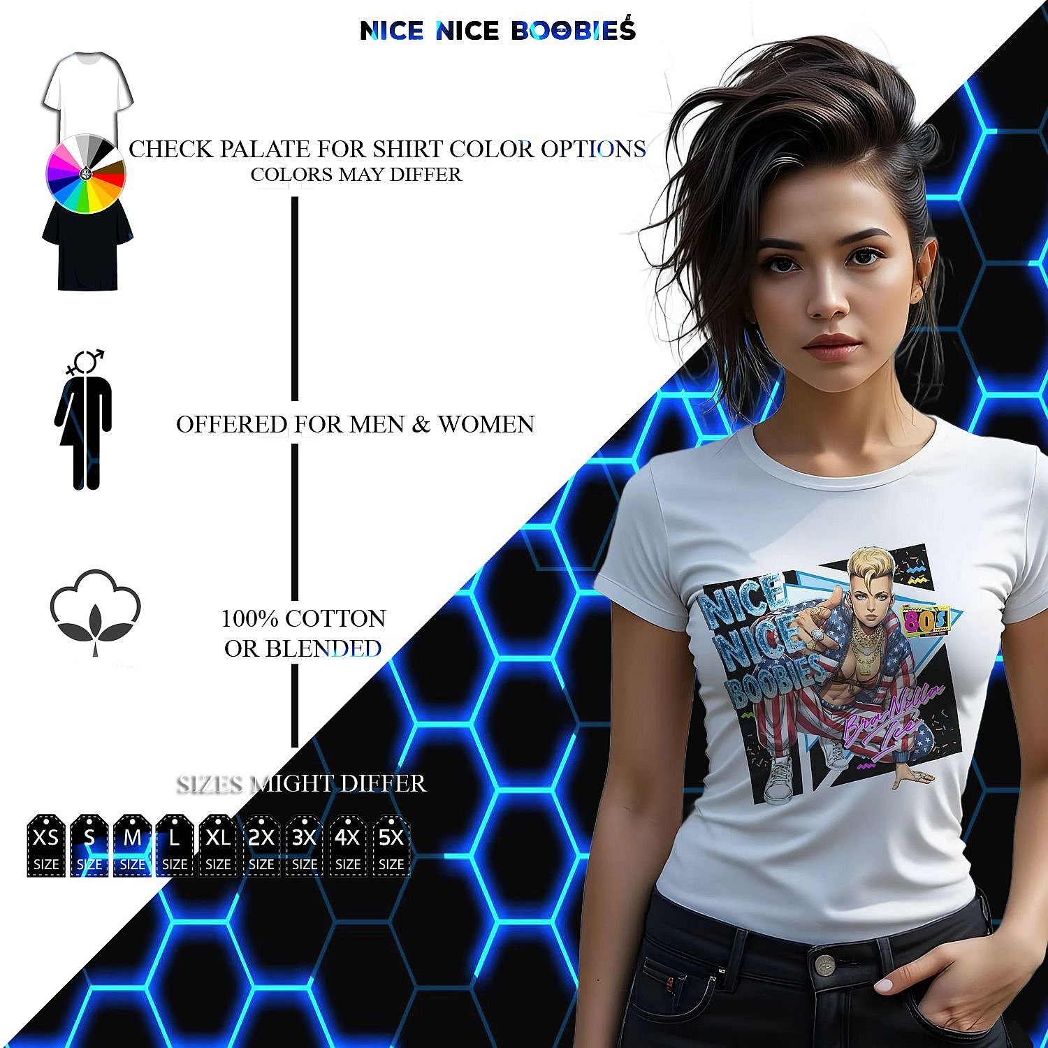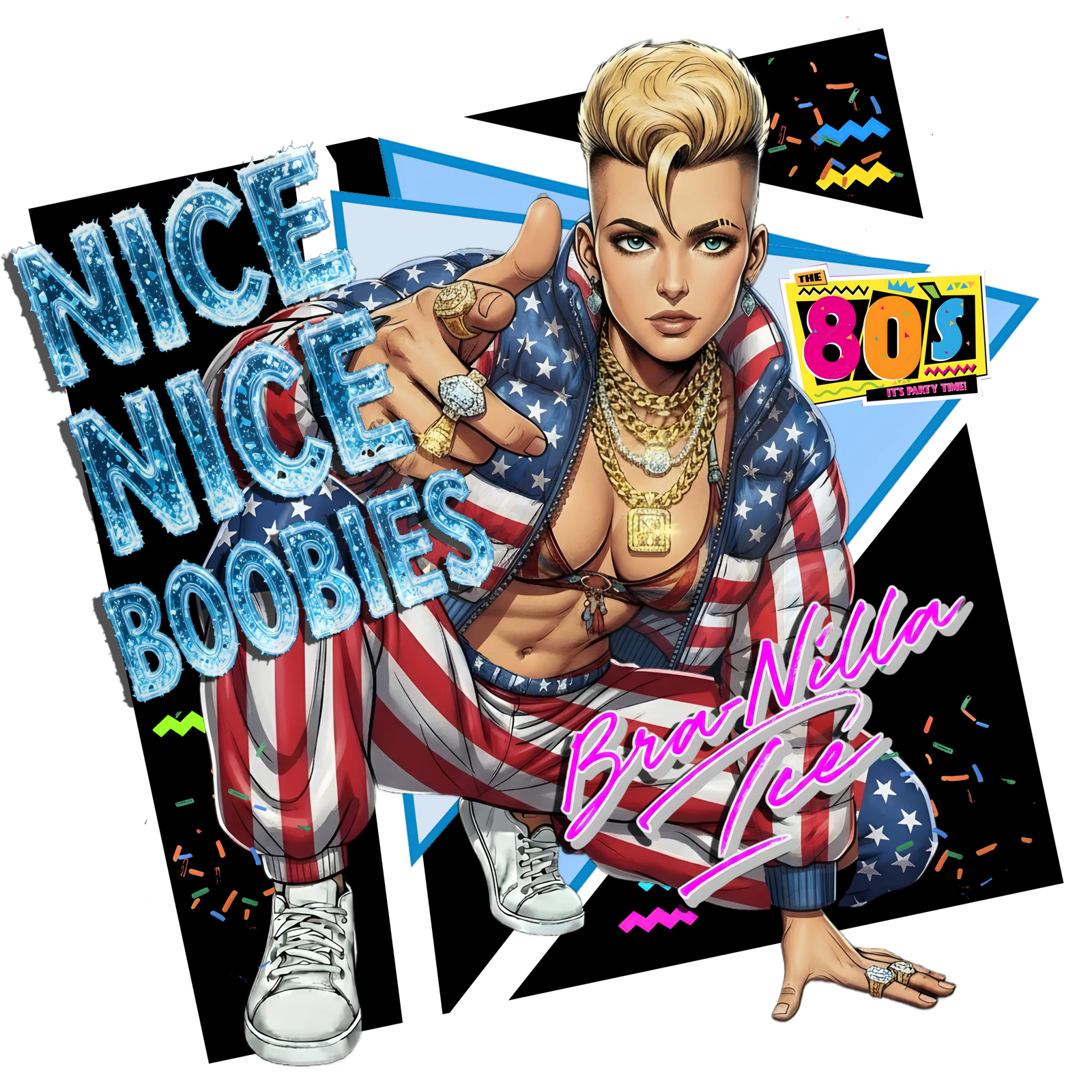 Get down with our BRA-Nilla Ice design.  Ice-cold attitude. Neon-hot energy. This tee time-travels straight to the late-night cable era…when boom boxes were king, synths slapped, and confidence came oversized. Our Tits R Cool BRA-Nilla Ice tee is a 90’s music television nod to the golden age of cassette clicks, chrome wheels, and unapologetic pop-rap-sap…So if it doesn’t turn heads, you’re wearing it wrong. Built for cruising with the windows down, this 100% cotton or blended tee is all about flirting with the volume knob, and flexing that don’t-care cool. This one hits with retro bravado and modern comfort…because throwback vibes deserve today’s quality.