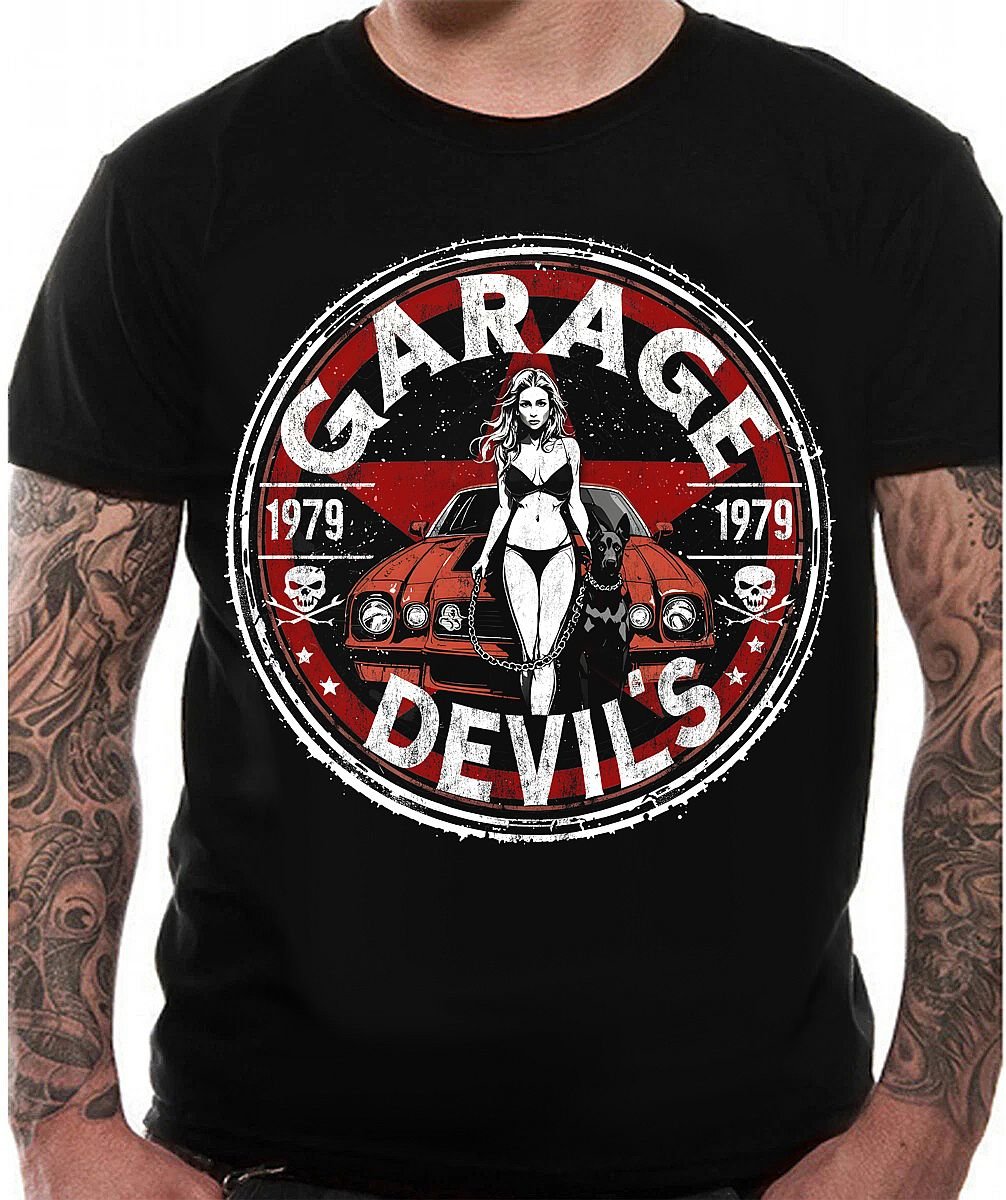 Our Garage Devil tee is a wicked slice of 1970’s muscle car culture, crafted from ultra-soft, high-quality 100% cotton or blended for unbeatable comfort and a perfectly worn-in feel. Front and center, a snarling ’79 Camaro steals the spotlight, while a sultry, busty beauty stands wickedly in front of the hood…paying homage to the golden era of gearheads, grease, and grit. With its vintage-faded finish and retro garage attitude, this shirt channels the spirit of late-night wrench sessions, roaring engines, and the raw, unapologetic style of those who live life at full throttle.