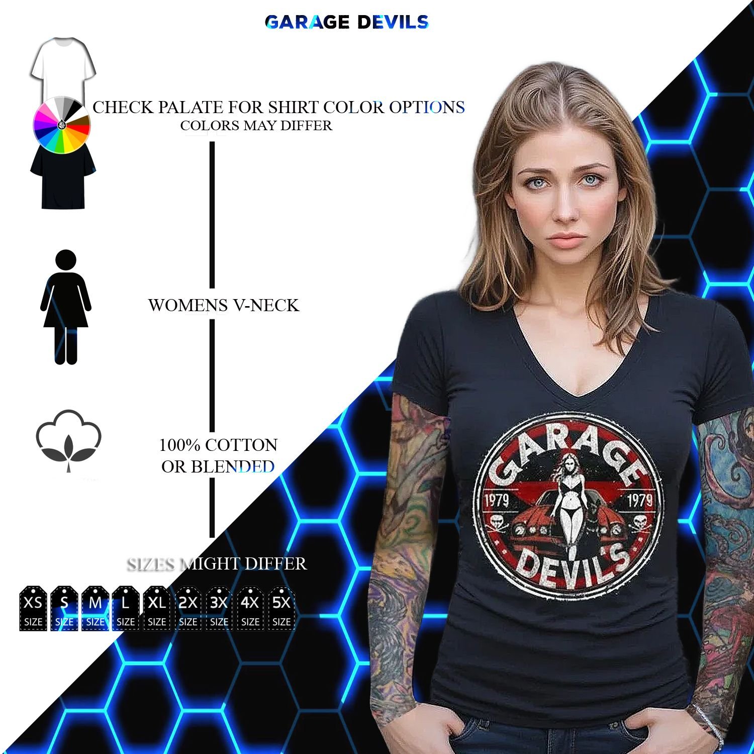 Our Garage Devils tee is a wicked slice of 1970’s muscle car culture, crafted from ultra-soft, high-quality 100% or blended cotton for unbeatable comfort and a perfectly worn-in feel. Front and center, a snarling ’79 Camaro steals the spotlight, while a sultry, busty beauty stands wickedly in front of the hood…paying homage to the golden era of gearheads, grease, and grit. With its vintage-faded finish and retro garage attitude, this shirt