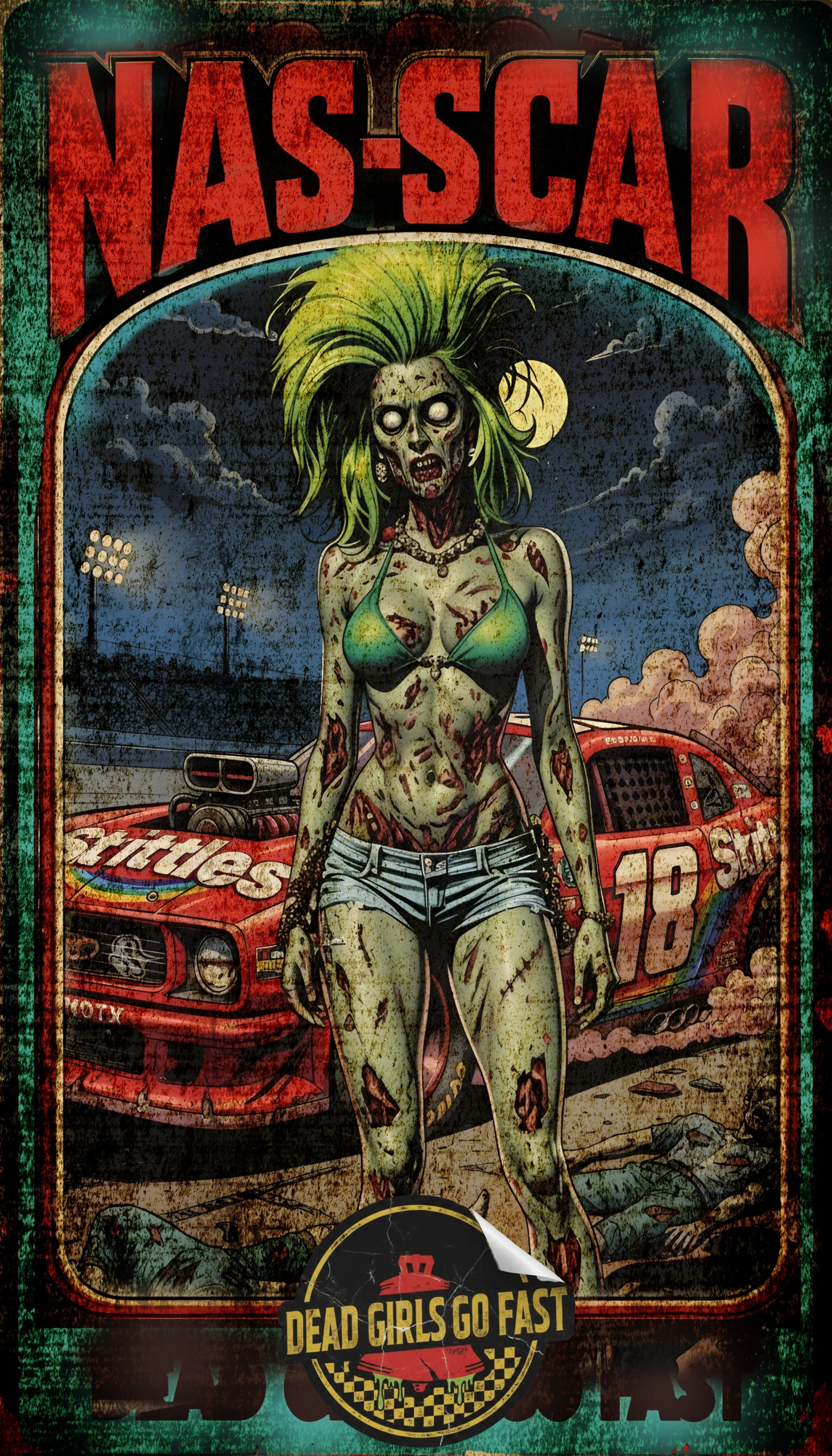 Our new Tits R Cool NAS-SCAR Collection drops the hammer with Dead Girls Go Fast. Midnight asphalt. Floodlights buzzing. Engines screaming like the afterlife just waved the green flag. Busty female zombies grip the wheel with coffin-cold hands, hair whipping in the slipstream, speedometer climbing like there’s no tomorrow…because there isn’t. Dead Girls Go Fast throws a flame-striped stock car into the graveyard straightaway, tires blazing, chrome flashing, as undead track sirens ride shotgun with victory on their minds and chaos in their veins. Fog rolls low over the circuit. Tombstones blur at 190. The checkered flag snaps in the night air while the crowd holds its breath. Equal parts horsepower hysteria and late-night