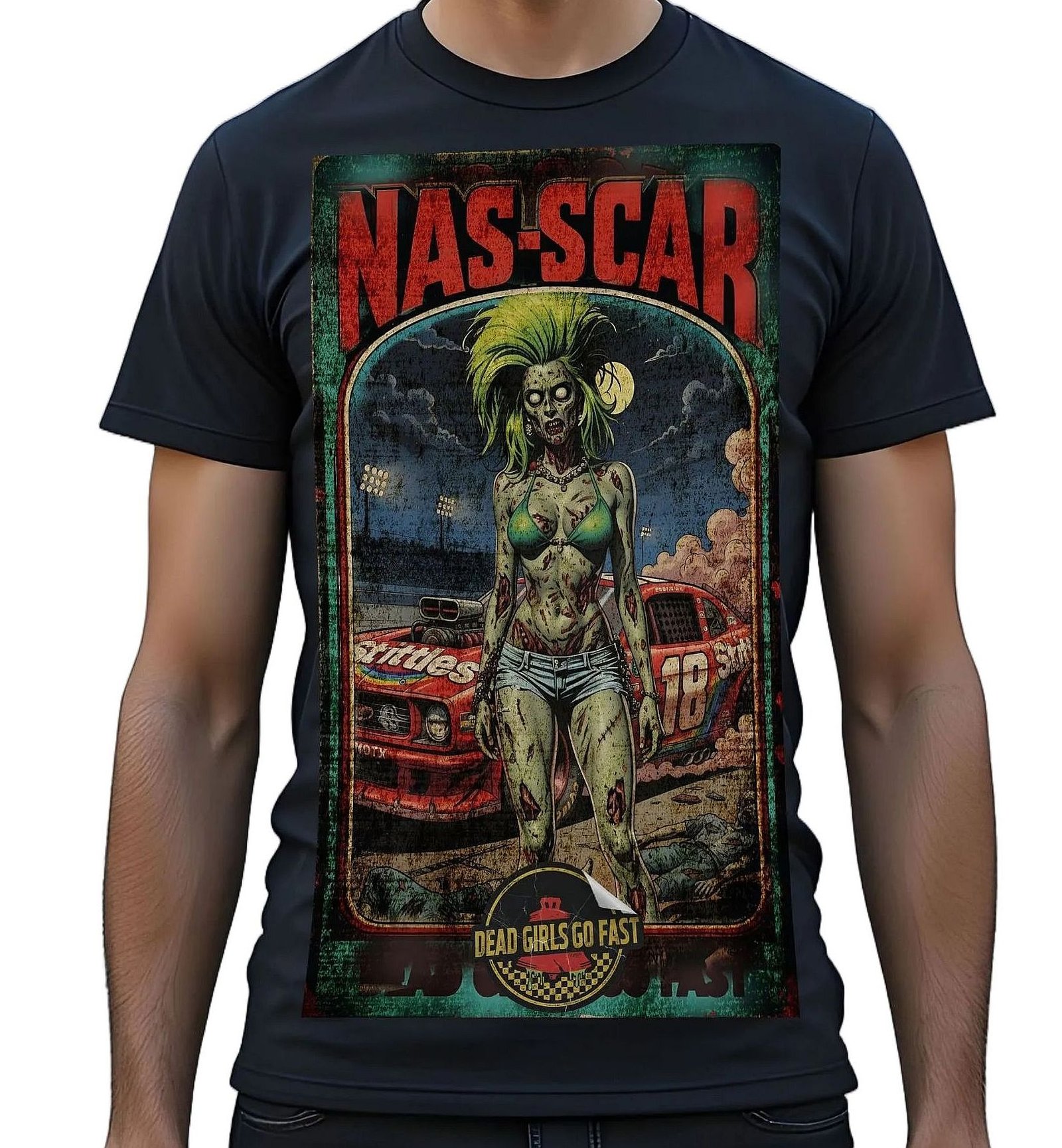Our new Tits R Cool NAS-SCAR Collection drops the hammer with Dead Girls Go Fast. Midnight asphalt. Floodlights buzzing. Engines screaming like the afterlife just waved the green flag. Busty female zombies grip the wheel with coffin-cold hands, hair whipping in the slipstream, speedometer climbing like there’s no tomorrow…because there isn’t. Dead Girls Go Fast throws a flame-striped stock car into the graveyard straightaway, tires blazing, chrome flashing, as undead track sirens ride shotgun with victory on their minds and chaos in their veins. Fog rolls low over the circuit. Tombstones blur at 190. The checkered flag snaps in the night air while the crowd holds its breath. Equal parts horsepower hysteria and late-night
