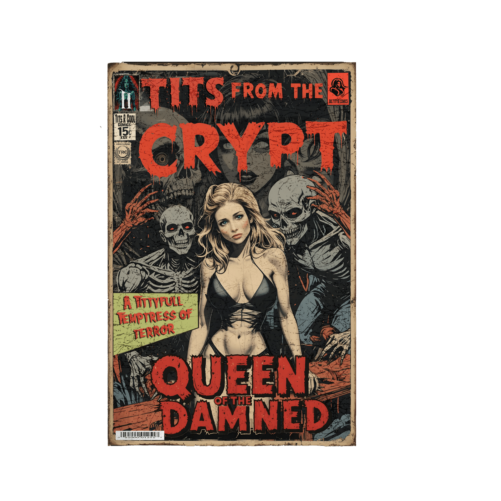 Our “Tits From The Crypt – Queen of the Damned” T rises straight from the graveyard of vintage cool. Inspired by old-school monster magazines, grindhouse flicks, and midnight horror hosts, this shirt drips with retro attitude and tongue-in-cheek charm. Featuring a hauntingly gorgeous woman surrounded by skeletons, it’s a love letter to campy horror, rock ’n’ roll rebellion, and unapologetic confidence. Printed on soft, 100% or blended cotton with a distressed comic-book vibe, this T feels like it’s been pulled from a forgotten drive-in era…equal parts spooky and sexy. Whether you’re howling at the moon or just hitting the scene, our “Tits From The Crypt” Collection of shirts reminds the world that being bold never dies.