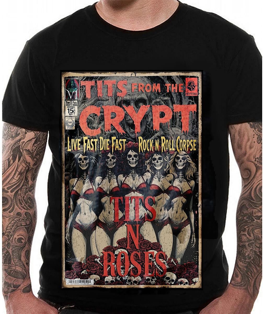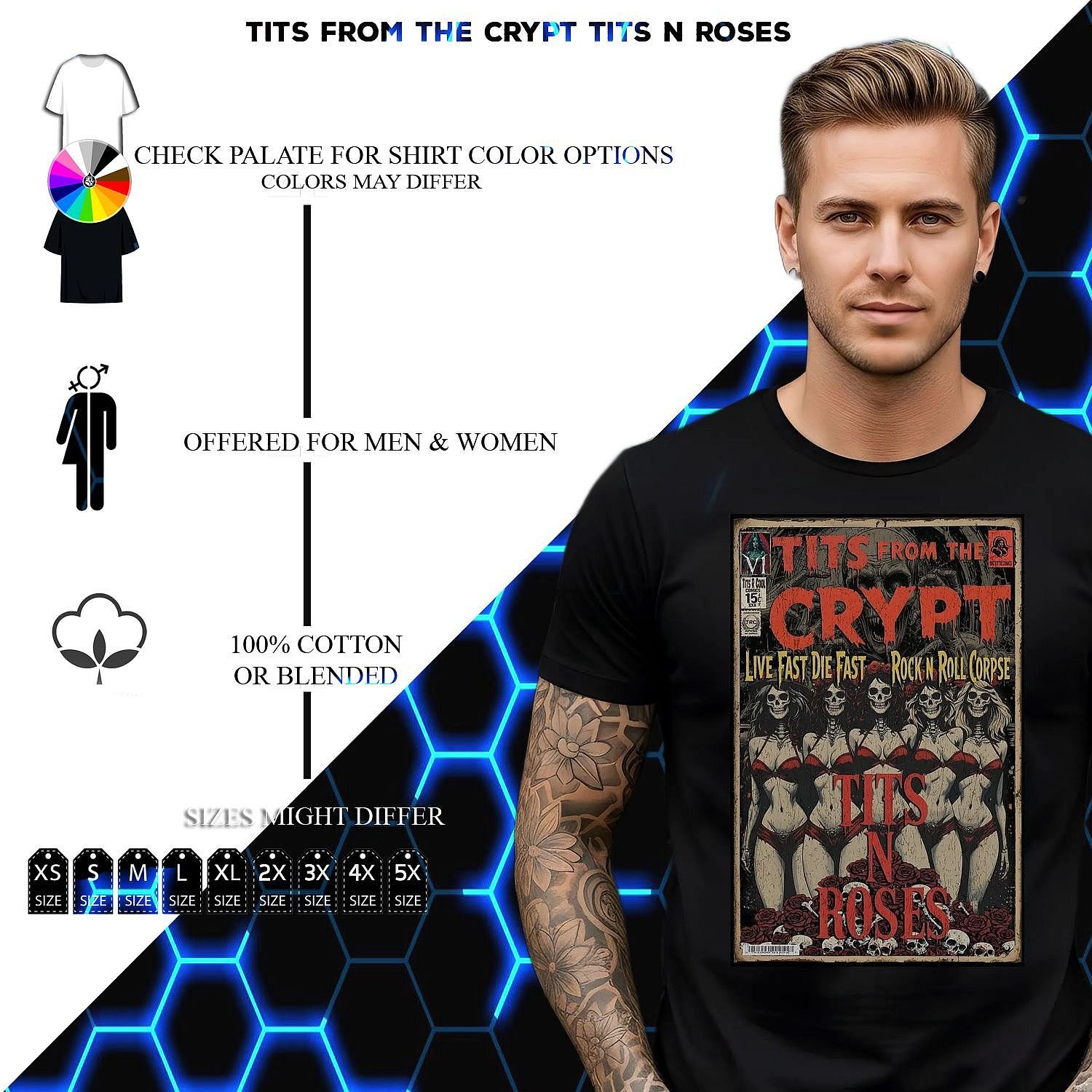 Our “Tits N Roses” tee from the “Tits From the Crypt” series cranks the volume on retro rock ‘n’ roll mayhem. Imagine five sizzling skeletons jamming under a spotlight, guitars blazing, and chaos blooming all around them…death has never looked this good. It’s vintage concert-poster vibes with a campy, tongue-in-cheek twist only our “Tits From the Crypt” series can deliver. Printed on soft, 100% or blended cotton, this shirt blends comfort with wild, over-the-top attitude. Cheeky, spooky, and full of rock-star swagger, “Tits N Roses” is the ultimate tee for anyone who loves their music loud, their style bold, and their mischief slightly undead.Tits N Roses