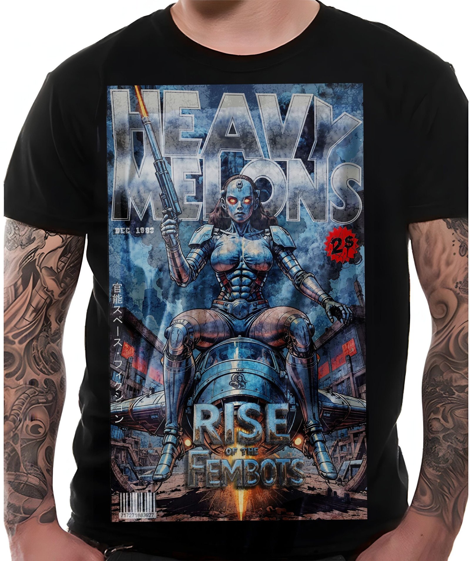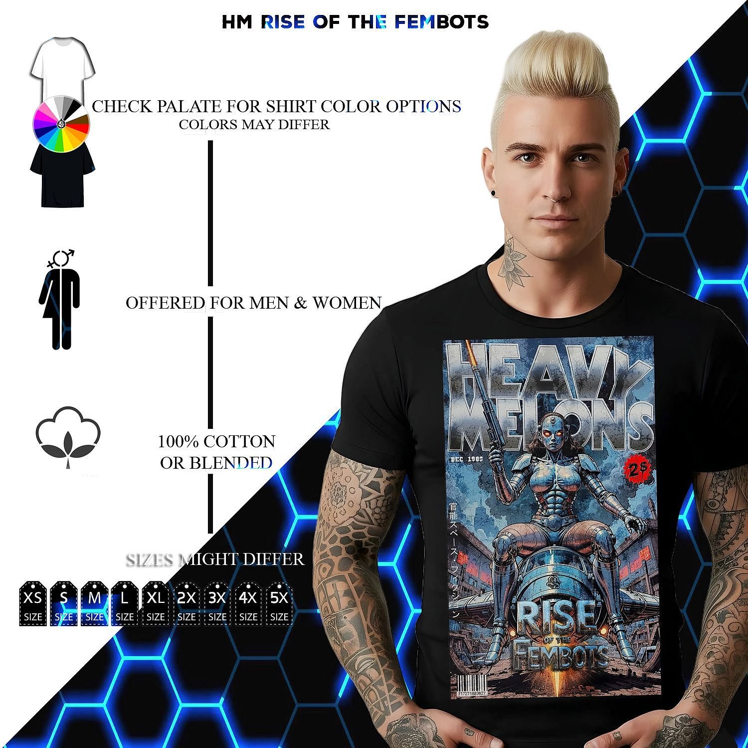 The Tits R Cool Heavy Melons Collection powers up with Rise of the Fembots, a chrome-plated fever dream pulled straight from the era when sci-fi fantasy was loud, glossy, and gloriously unrestrained. This design features a busty female robot, forged in shining metal with thighs and curves for days, straddling a rocket-bound spaceship as the future burns behind her. Equal parts pulp prophecy and rock-and-roll rebellion, Rise Of The Fembots celebrates power, beauty, and unapologetic form in a world gone cold and mechanical. Printed on a premium 100% cotton or blended tee, it delivers lasting comfort, durability, and a fit that holds strong through every uprising. Slick on the surface. Dangerous underneath. Plug in. Lift off. Let the future stare back.
